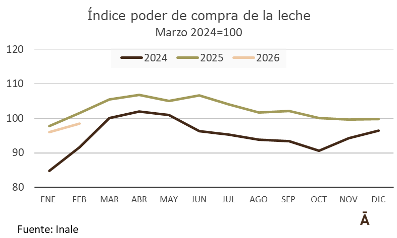 Poder de compra de la leche mejoró en febrero; sigue por debajo de 2025