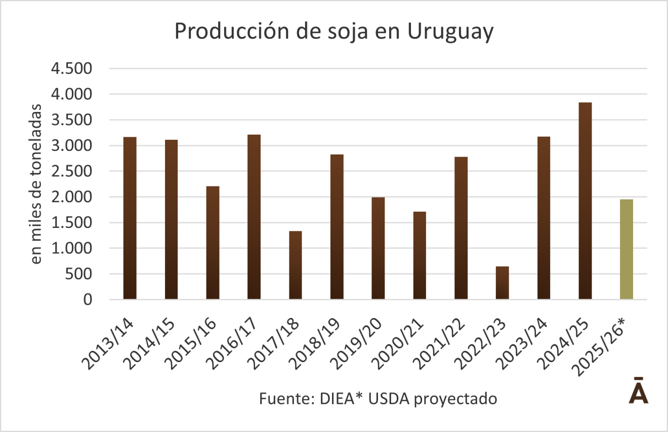 Según el USDA, Uruguay continuará siendo un exportador casi exclusivo de grano, con embarques proyectados en torno a 2,8 millones de toneladas para la próxima campaña, principalmente hacia China. En contraste, la industrialización local seguirá siendo limitada, con un crushing estimado en apenas 150 mil toneladas, reflejo de una capacidad instalada reducida y un mercado interno de subproductos poco dinámico.