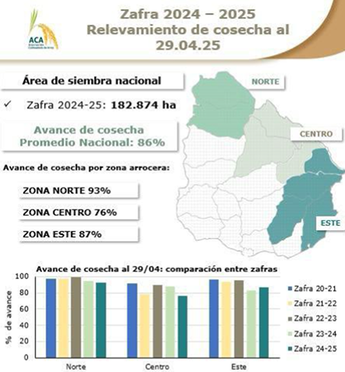 La cosecha de arroz en Uruguay avanza a paso firme, alcanzando un promedio del 86% de la superficie total sembrada para la zafra 2024/25. Con un área cultivada que totalizó 182.874 hectáreas, el país se encamina hacia la finalización de las labores de recolección.