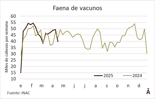 Como siempre sucede en la semana de Pascuas, se produjo un descenso en la faena de vacunos. INAC informó que en la semana al 19 de abril ingresaron a planta 39.723 vacunos, unos 10 mil menos que en la anterior.