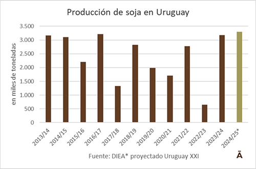 “Uruguay se encamina a una de las mejores cosechas de soja en 2025, con una producción que podría superar los 3,3 millones de toneladas, siempre que las condiciones climáticas se mantengan favorables. A pesar de una leve reducción en el área sembrada, estimada en 1,2 millones de hectáreas, se prevé que los rendimientos alcancen 2,9 toneladas por hectárea, impulsando la producción total”, indicó en su último informe de comercio exterior de bienes el instituto Uruguay XXI. De confirmarse esa producción de la oleaginosa para Uruguay se superaría el máximo histórico vigente de la zafra 2016/17, que fue levemente superior a 3,2 millones de toneladas. En la campaña anterior (2023/24), la producción de soja fue de 3,176 millones de toneladas, según la DIEA.