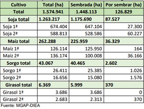 De acuerdo a la última Encuesta Agrícola primavera-verano 2024/25 que divulgó la DIEA el pasado viernes, la intención de siembra para los cultivos de verano con destino a grano seco se estimó en 1.574.941 hectáreas, un 3,5% más que en la zafra anterior cuando se sembraron 1.522.363 hectáreas (+50 mil ha). En el caso de la soja, la DIEA estimó una superficie de 1,26 millones de ha (-6%), de 262 mil ha en maíz (+12%), de 43 mil en sorgo, y de 6.300 ha de girasol. Una de las sorpresas la dio el cultivo de sorgo, que tuvo un crecimiento interanual del 153% (+26 mil ha) y alcanzó su mayor superficie desde la zafra 2016/17.