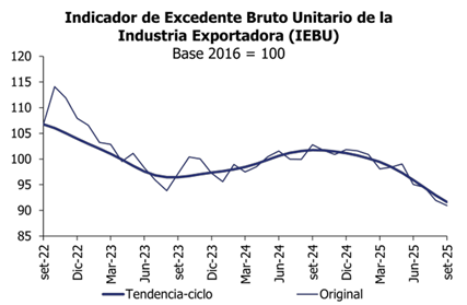 Finalmente, el IEBU (Indicador de Excedente Bruto Unitario de la Industria Exportadora), ajustó 5,2% a la baja durante el tercer trimestre de 2025 respecto al trimestre anterior. En la comparación interanual este indicador se ubica 8,4% por debajo de lo observado en el mismo trimestre de 2024, como resultado del aumento de los costos unitarios y caída de los precios de exportación.