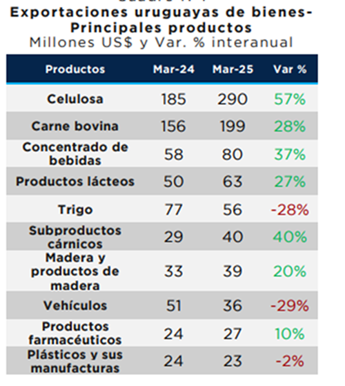 En el acumulado del año 2025, con la culminación del primer trimestre del año, las exportaciones de bienes, incluidas las zonas francas, totalizaron US$ 2.896 millones, con un incremento interanual de 5%. El balance del primer trimestre de 2025 fue positivo. La carne bovina, que alcanzó los US$ 614 millones en el trimestre y tuvo un crecimiento interanual de 24%, se consolidó como el producto más exportado. La celulosa se mantuvo en segundo lugar con US$ 552 millones. El top cinco los complementaron los concentrados de bebidas, productos lácteos y trigo.