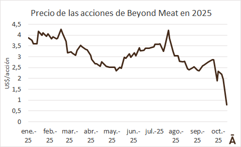 El precio de la acción de Beyond Meat cayó ayer a menos de US$ 1 por primera vez en su historia, luego de haber alcanzado un tope de US$ 230 por acción seis años atrás, cuando la idea de que los alimentos proteicos basados en materia prima vegetal tenderían a quitarle una proporción de mercado significativa a la proteína animal.