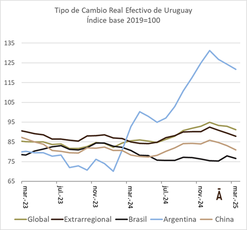 El índice de Tipo de Cambio Real (TCR) efectivo global de Uruguay cerró marzo en 91,2, cayó 1,8% respecto a febrero y -3,9% en el acumulado del primer trimestre del año, según publicó el Banco Central del Uruguay (BCU). El país ha perdido pie con la mayoría de sus principales socios comerciales y competidores en el período enero-marzo. Por ejemplo, con China (principal destino para los bienes) se produjo un deterioro del 5,7%, con EEUU del -4,9%, con México (-5,2%), Alemania (-2,3%) o el Reino Unido (-3,4%).