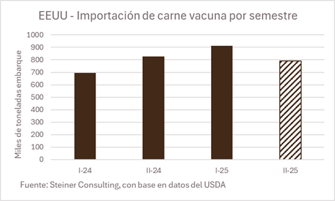 De acuerdo con proyecciones de la consultora Steiner, basadas en datos del USDA, en el segundo semestre de 2025 las importaciones estadounidenses de carne vacuna se contraerán 4% anual y 13% respecto al primer semestre del año, una reducción de 121 mil toneladas. Si la tendencia de los semestres anteriores continuara, Estados Unidos debería importar poco más de 1 millón de toneladas en el semestre, en lugar de las 800 mil toneladas que se proyecta que importará, por lo que habrá alrededor de 200 mil toneladas menos de carne vacuna importada, lo que ejercerá presión al alza sobre los precios del mercado en Estados Unidos.