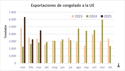 A su vez, se ha dado un acortamiento de la brecha entre el valor medio del enfriado y el congelado. En marzo de 2024 el enfriado se exportó a un sobreprecio de US$/t 2.900, en tanto que en marzo de 2025 la brecha se achicó a US$/t 1.550.