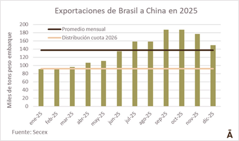 Es que Brasil debería pasar de un promedio mensual de 137 mil toneladas exportadas a China en 2025 a una media de 92 mil toneladas este año, 33% menos. Uno de cada tres kilos embarcados por los exportadores brasileños debería buscar otro destino, ya sea en otros países importadores como en el mercado doméstico.