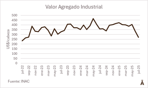 El valor medio del Novillo Tipo 2.0 (NT) tuvo una mínima suba mensual en julio, pero con notorias diferencias en las variables que la componen, dado que se dio una suba significativa en el valor de compra del novillo y un brusco descenso de lo que el INAC denomina el Valor Agregado Industrial (VAI), que engloba todos los otros costos y, eventualmente, el margen industrial.