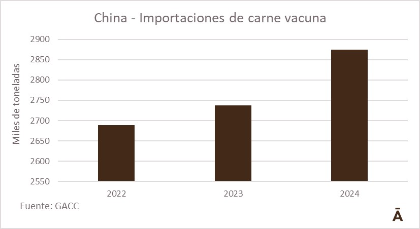 En 2024 China importó 2,87 millones de toneladas de carne vacuna fresca, en un volumen que crece año a año. La cuota, en principio, sería de una cantidad cercana a estos volúmenes de importación anual.