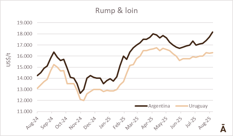 En el caso de Uruguay, las fuentes manejaron negocios en un rango de US$ 16.300-16.500 FOB durante la última semana. También se reportaron negocios de nalga congelada de Uruguay a Italia a US$/t 7.400-7.500 CFR.