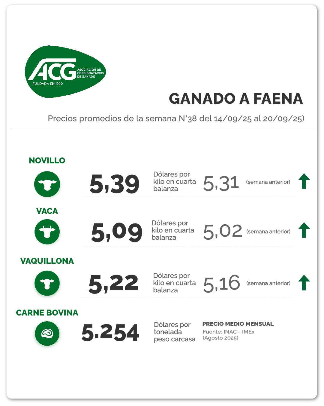 Los precios del ganado gordo se encaminan a superar el máximo nivel nominal que se alcanzó durante el año 2022. Este lunes los consignatarios elevaron en 8 centavos la referencia para el novillo a US$ 5,39 por kg carcasa en promedio para los negocios cerrados al 20 de setiembre. “Con entradas ágiles; mercado firme y demandado”, dijo la ACG en su comentario.