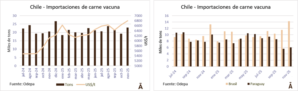 En el acumulado del año a noviembre Chile importó 231.270 toneladas de carne vacuna a un valor medio 6.458, con un moderado aumento de 2% en el volumen y de 15% en el caso del valor medio. En este período las importaciones desde Brasil crecieron 24% anual, convirtiéndose en el principal proveedor, en tanto que las de Paraguay bajaron 12%.