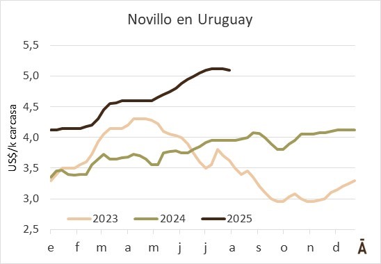 La mayoría de los negocios se hacen a los mismos precios que en las semanas precedentes, pero es más dificultoso acceder a los precios de punta. “Los novillos se siguen vendiendo entre US$ 5,00 y US$ 5,10”, afirmó otra fuente consultada, quien agregó que es más dificultoso acceder a los precios de punta en el caso de las vacas, cuyo eje va de US$ 4,80 a US$ 4,85. Las vaquillonas cotizan en un eje de US$ 4,95 el kilo carcasa.