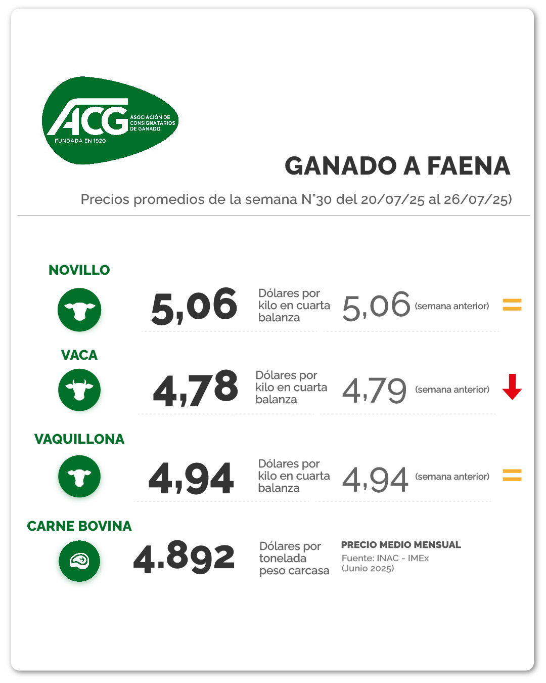Los consignatarios dejaron sin cambios la referencia promedio para el novillo gordo en la semana al 26 de julio en US$ 5,06 por kg carcasa, al igual que para la vaquillona en US$ 4,94, al tiempo que corrigieron en 1 centavo a la baja el valor de la vaca gorda a US$ 4,78.