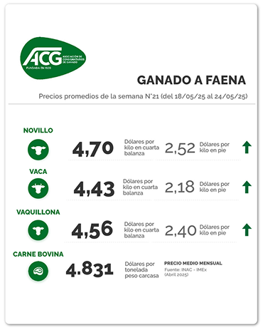 Con un “mercado firme” y con “entradas cortas”, los precios de la hacienda volvieron a tonificarse durante la última semana cerrada al 25 de mayo. Tras su reunión de precios de este lunes, la ACG fijó una referencia promedio de US$ 4,70 por kg carcasa para el novillo gordo (+5 cents), de US$ 4,43 por kg para la vaca gorda (7 cents) y de US$ 4,56 (+5 cents) para la vaquillona.