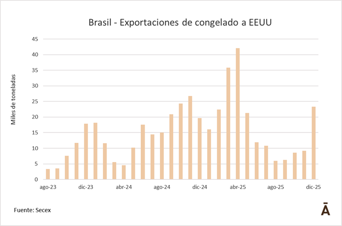 Las exportaciones brasileñas de carne vacuna a Estados Unidos pegaron un salto en diciembre, volumen que fue el que ingresó dentro de la cuota de terceros países —junto, seguramente, a una proporción significativa de lo embarcado en los dos meses previos— en los primeros días del corriente año.