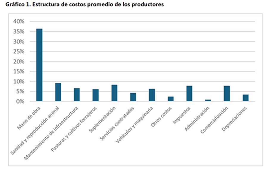En segundo lugar aparece sanidad y reproducción, cercano al 10% del total, seguido por rubros como suplementación, impuestos y costos de comercialización. La administración es el componente de menor incidencia, con apenas 1% en promedio.