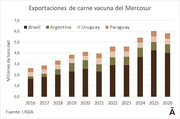 Las exportaciones de carne vacuna del Mercosur caerían 205 mil toneladas en 2026, hasta 5,815 millones de toneladas, ya que los aumentos de Argentina y Uruguay compensarían solo parcialmente las reducciones de Brasil y Paraguay.
