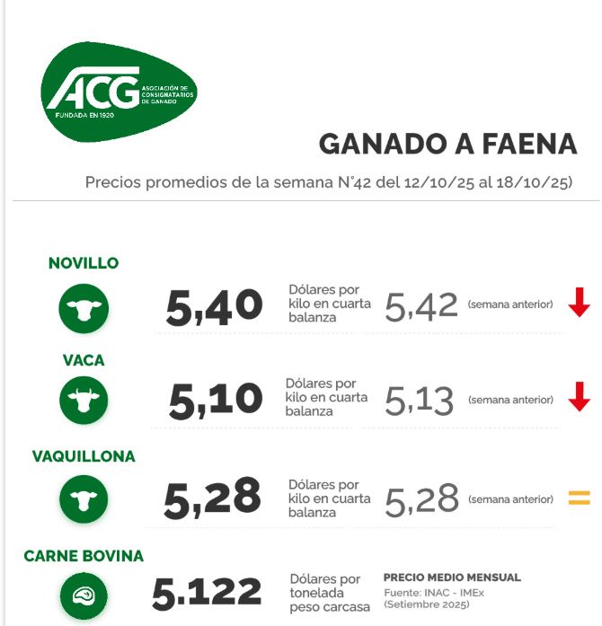 En el caso de la reposición, “con crecimiento de la oferta propio de la época, moderado ajuste de valores”, indicó la ACG. El ternero quedó una referencia promedio de US$ 3,51 por kg en pie (-4 cents), la ternera quedó sin cambios en US$ 3,23, mientras que la vaca de invernada cedió 4 cents a US$ 2,31 por kg.