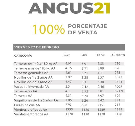 Los terneros generales AA hicieron un promedio de US$ 4,11 por kg (US$ 773 al bulto). En tanto, los novillos de 1 a 2 años AA hicieron US$ 3,57 por kg de promedio (US$ 1.077 al bulto), al tiempo que ls terneras AA hicieron US$ 3,97 por kg (US$ 692 al bulto).