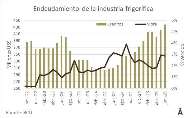 Pese al incremento del financiamiento, la cartera de créditos en condición de vencidos que tenía la industria frigorífica no ha mostrado grandes sobresaltos durante el último año móvil. En junio tenía unos US$ 12,5 millones en mora (2,9% del total), muy similar al 3% que registró en igual mes del año pasado.