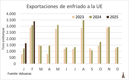 De acuerdo con datos de Aduanas, las solicitudes de exportación a la UE acumularon 4.905 toneladas en el mes, de las que 3.392 tons eran enfriadas y 1.513 tons congeladas. El volumen enfriado superó en 300 toneladas al de febrero de 2024.