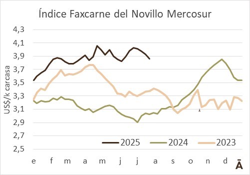 La fuerte baja en los precios de la hacienda a faena en Brasil está teniendo un impacto significativo sobre el valor medio del ganado en la región. El Índice Faxcarne del Novillo Mercosur perdió 7 cents en la semana a US$ 3,86 el kilo carcasa, el nivel más bajo desde principios de junio.