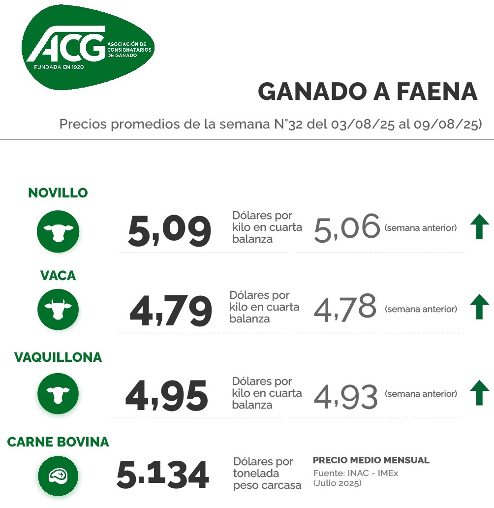 “Mercado firme y demandado”, dijo la ACG en su comentario de este lunes por la noche. La planilla de precios de los intermediarios elevó la referencia del novillo gordo a US$ 5,09 por kg a la carne y en US$ 4,79 para la vaca, con una suba de tres y un centavo respectivamente. En el caso de la vaquillona la referencia de US$ 4,95, marcó una suba de dos centavos, para la semana cerrada el 9 de agosto.