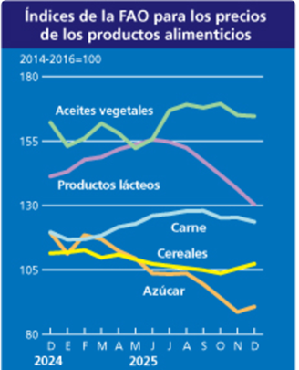 El índice de precios de la carne de la FAO registró en diciembre un promedio de 123,6 puntos, es decir, 1,7 puntos (1,3%) menos que su valor revisado de noviembre, pero aun así se ubica 4,1 puntos (3,4%) por encima del nivel alcanzado hace un año.