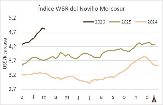 Luego de haber alcanzado un récord en términos históricos la pasada semana, el índice del Novillo Mercosur de World Beef Report (WBR) perdió 4 centavos y cerró a US$ 4,81 por kg a la carne. La principal razón de este descenso estuvo asociada a la apreciación que registró el dólar a nivel regional (y mundial) tras la escalada del conflicto en Medio Oriente.