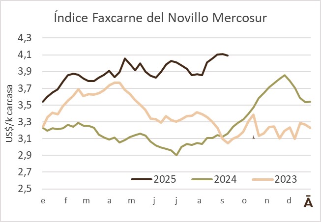 La contundente derrota del oficialismo en la provincia de Buenos Aires, donde está radicado el 40% de la población de Argentina, generó volatilidad e incertidumbre en los mercados, con un descenso de 3,7% en el tipo de cambio en el país que impactó sobre las referencias de los precios del ganado no solo en Argentina, sino también en el promedio regional. El Índice Faxcarne del Novillo Mercosur bajó 2 cents en la semana a US$ 4,09 el kilo carcasa, dejando atrás cuatro semanas de recuperación.