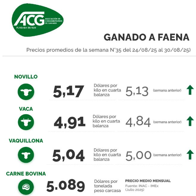 Los precios de la hacienda y la reposición cerraron agosto a todo vapor. De acuerdo al comentario de la reunión de precios de la ACG de este lunes, con una "oferta reducida y firmeza en los valores", el mercado de hacienda se mostró "ágil" en la semana cerrada al 30 de agosto.