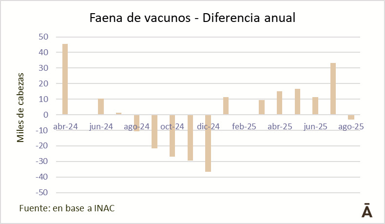 La faena de vacunos agudizó la tendencia a la baja en la última semana de agosto y fue la menor cantidad en 25 semanas, desde la primera de marzo. INAC informó que en los siete días al 30 de agosto ingresaron a planta 39.345 vacunos, 4.490 menos que en la semana anterior, aunque 451 cabezas más que en la misma del año pasado.