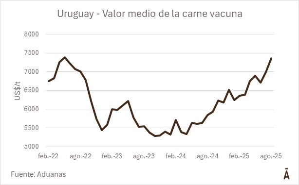 Uruguay embarcó al mercado internacional 33.017 toneladas peso embarque de carne vacuna a un valor medio de US$/t 7.356, de acuerdo con datos de solicitudes de exportación informados por Aduanas. El volumen fue casi 1.600 toneladas mayor que el de julio y el valor medio aumentó 5,1% mensual, quedando escasos US$/t 25 por debajo del récord de mayo de 2022, cuando llegó a US$/t 7.381.