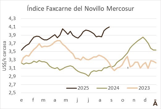 El valor medio del ganado a faena en el Mercosur tendió al alza por tercera semana consecutiva. El Índice Faxcarne del Novillo Mercosur aumentó 4 cents a US$ 4,10 el kilo carcasa, acumulando una recuperación de 24 cents en tres semanas.