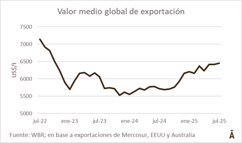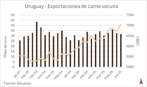El valor medio de exportación de carne vacuna uruguaya en julio fue de US$/t 7.053, de acuerdo con datos de solicitudes de exportación informados por Aduanas. El valor medio supera los US$ 7.000 por tonelada embarque desde mediados de 2022, cuando se habían alcanzado los precios más altos de la historia, impulsados por la demanda de China.