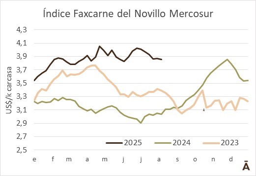 El valor medio del novillo a faena en el Mercosur perdió 1 cent en la semana a US$ 3,86 el kilo carcasa como consecuencia del impacto de la fuerte baja de la referencia en dólares en Argentina. La debilidad del tipo de cambio (bajó 5,8% en la semana), la efectivización de la rebaja del arancel a la exportación de carne de novillo (de 6,75% a 5%, vigente desde mediados de la semana pasada) y la estabilidad de los precios en pesos argentinos impactaron fuertemente en la referencia en dólares que perdió 33 cents en la semana a US$ 4,36 el kilo carcasa.