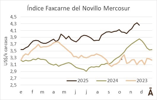 Tras los máximos en más de tres años de la semana pasada, el valor medio del ganado a faena en los países del Mercosur corrigió a la baja en la corriente. El Índice WBR del Novillo Mercosur perdió 7 cents a US$ 4,26 el kilo carcasa, con correcciones a la baja en tres de los cuatro países del bloque.