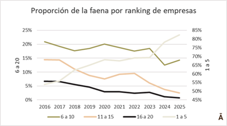 La tendencia hacia la concentración de la industria frigorífica en Uruguay se aceleró en 2025. Más de 1 de cada 2 vacunos (51,7%) se faenaron en los dos principales grupos, MBRF y Minerva, en tanto que más de 4 de cada 5 (82%) son procesados por las cinco principales empresas del sector.