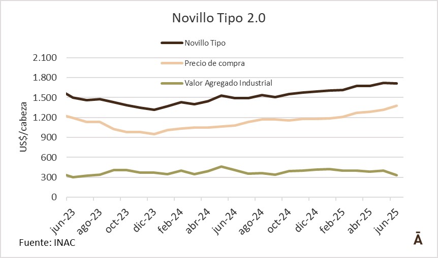 El Instituto Nacional de Carnes (INAC) dio a conocer el informe mensual del Novillo Tipo 2.20. El Valor Agregado Industrial (VAI) —que incluye costos y beneficios de la industria— llegó a su menor nivel porcentual de participación desde junio de 2023, mientras que la hacienda registró el mayor valor desde septiembre de 2022.