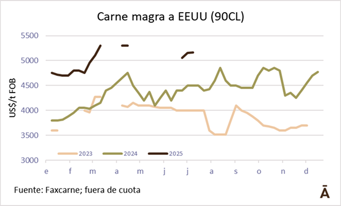 “Ayer (por el lunes) el mercado se murió, ahora hay que esperar unos días”, opinó un trader que opera con el mercado estadounidense. Manejó últimas referencias de la semana pasada, cuando el mercado estaba más animado, a US$ 5.150-5.170 CFR para la carne magra 90 CL, el grueso de lo que exporta Uruguay. Desde Argentina una fuente manejó una referencia de US$/t 8.200 FOB por la nalga.