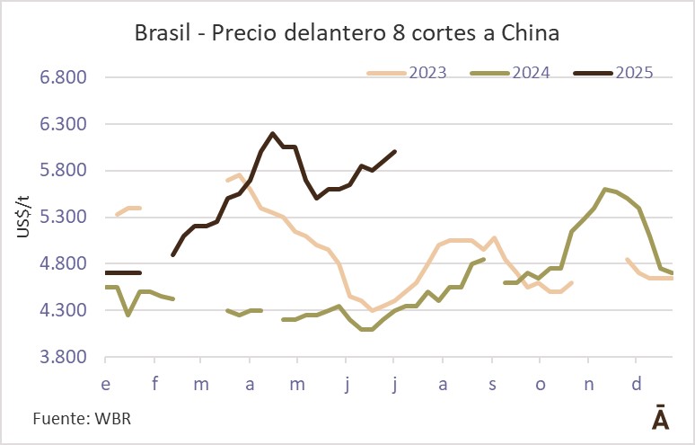 La corriente comercial con China todavía no logra la fluidez que algunos exportadores pretenden. Un exportador brasileño comentó a World Beef Report (WBR) que si bien a fines de la pasada semana logró cierres por delantero 8 cortes hasta US$/t 6.100 CFR, ahora nuevamente el mercado lucía “más complicado” para convalidar ese valor, con una demanda que se mostraba “más floja”.