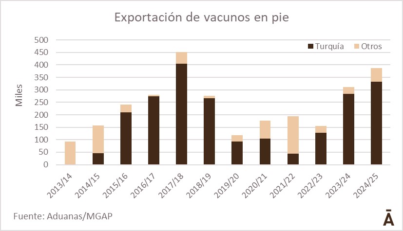 La exportación de vacunos en pie creció en 76 mil cabezas en el ejercicio 2024/25 (jul-jun), o 25%, impulsada por el crecimiento de la demanda de Turquía, donde el precio de los animales a faena está sumamente recalentado, con cotizaciones por encima de los US$ 11 por kilo carcasa.