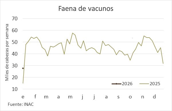 Aunque en niveles lógicamente moderados debido al feriado de fin de año y la menor actividad en buena parte de las industrias, la faena de vacunos comenzó el año 2026 a un ritmo superior al registrado en los mismos días un año atrás.