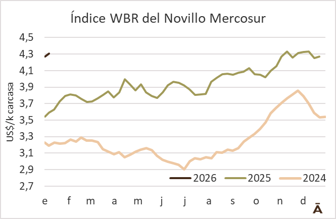 El valor medio del ganado para faena en la región comenzó 2026 en alza. El Índice WBR del Novillo Mercosur subió 4 cents en la semana a US$ 4,31 el kilo carcasa, acercándose a los máximos alcanzados sobre fines del año pasado.