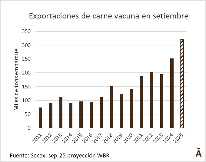 Nunca Brasil había embarcado más de 300 mil toneladas de carne vacuna en un solo mes. Lo hizo por primera vez en setiembre. De acuerdo con datos de la Secretaría de Comercio Exterior (Secex), restando dos días hábiles para completar el mes ya se habían exportado 294,7 mil toneladas a un ritmo diario de 14.735 tons. Suponiendo un ritmo similar en los dos días restantes de setiembre de esta semana, el volumen estaría sumando en el entorno de las 320 mil toneladas, superando en unas 50 mil tons el registro de agosto y en 70 mil tons el de setiembre del año pasado.