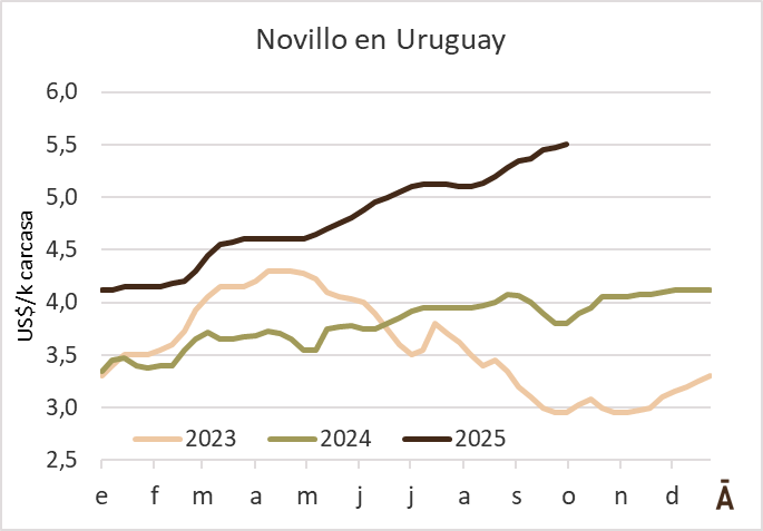 El gerente comercial de Valdez & Cía, Ricardo Pigurina, señaló a Informe Tardáguila que la firmeza del mercado del gordo empieza a mostrar señales de haber alcanzado un techo. “Pareciera que estamos llegando a una meseta en los precios. Veníamos con una suba mantenida desde hace diez meses y ahora el mercado parece estabilizarse”, comentó.