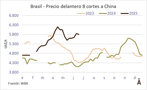 La dinámica de recuperación en los precios que venía mostrando China tuvo una “cierta pausa” al inicio de esta semana por parte de algunos agentes. Dos exportadores brasileños comentaron a World Beef Report (WBR) que los US$/t 6.000 CFR que llegaron a manejarse para el delantero en 8 cortes hasta fines de la semana pasada, ahora no se estaban logrando convalidar. Una de las industrias dijo que lo máximo que llegaba a recibirse como contraofertas eran US$/t 5.800 CFR, mientras que otro consideró que las mejores marcas podían lograr unos US$/t 100 más.